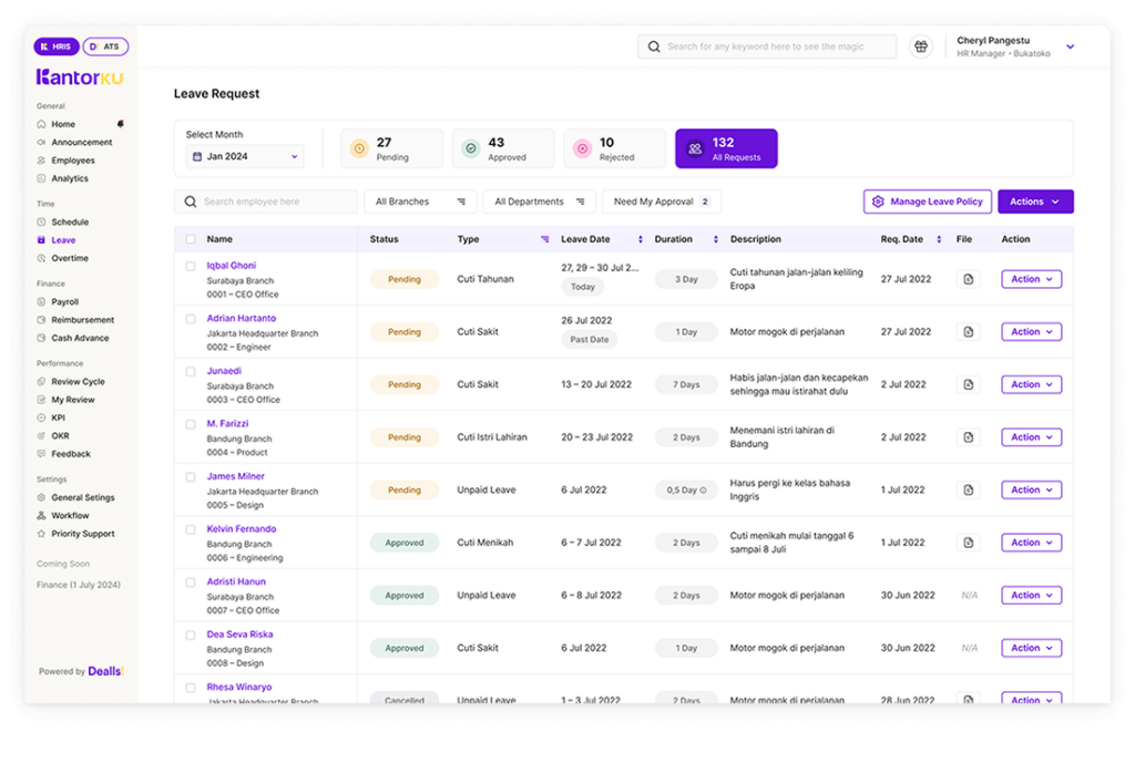 - Kalender Cuti: HR dan manajer bisa memantau jadwal cuti seluruh tim dengan mudah.