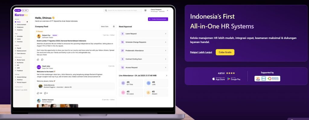 KantorKu HRIS adalah alternatif aplikasi HRIS Orange HRMS yang dirancang khusus untuk kebutuhan bisnis di Indonesia.
