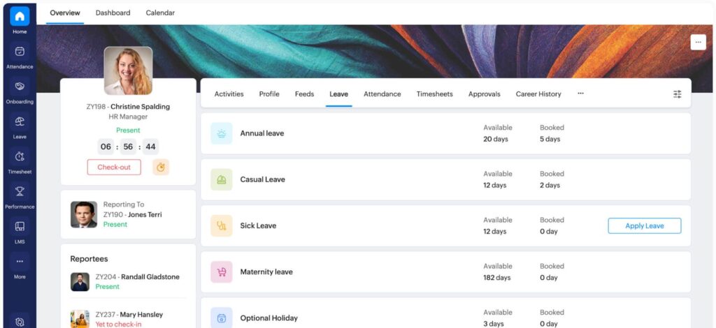 Zoho People memiliki salah satu modul pengajuan cuti karyawan berbasis web dengan tingkat kustomisasi yang tinggi.