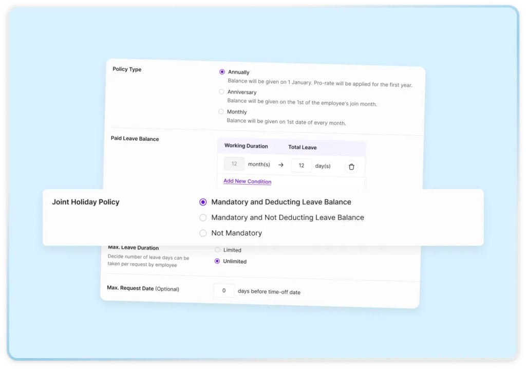 HR dapat membuat dan mengatur kebijakan cuti sesuai regulasi perusahaan dan ketentuan pemerintah, termasuk pengaturan cuti tahunan, cuti khusus, hingga skema saldo cuti yang dapat dibawa ke tahun berikutnya.