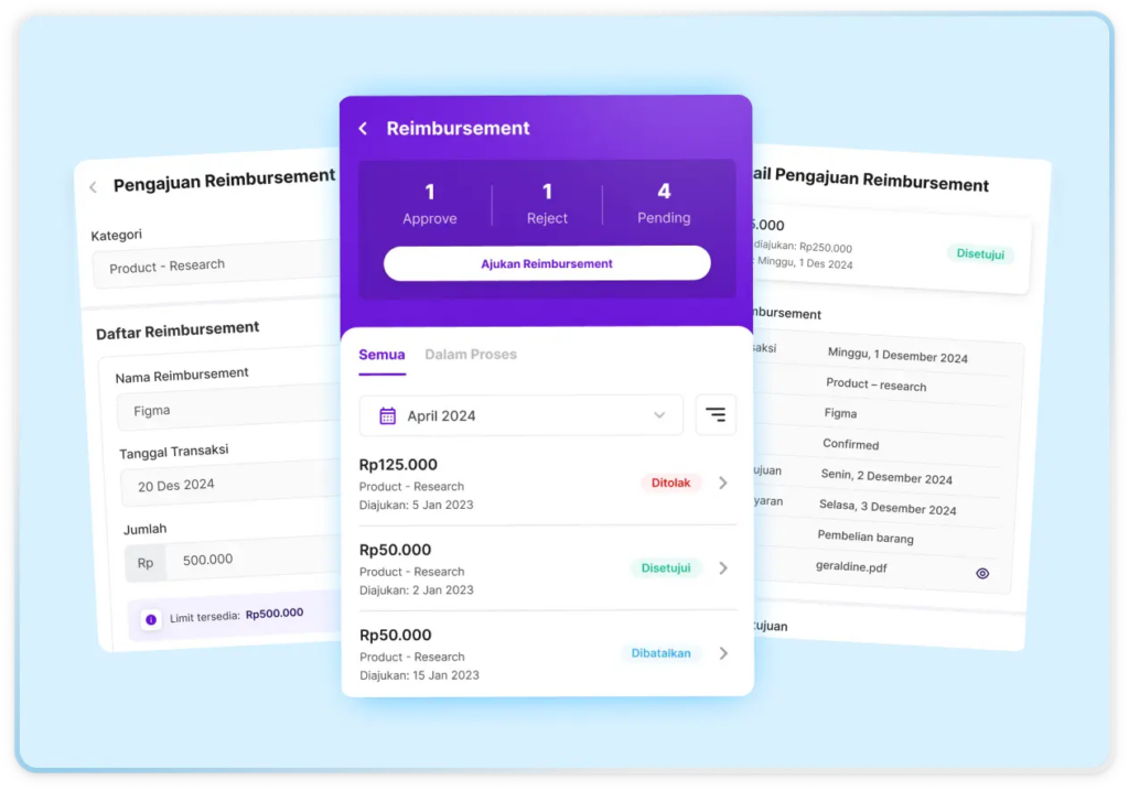 - Terintegrasi dengan payroll, nilai reimbursement otomatis masuk ke sistem payroll tanpa input ulang, sehingga mengurangi risiko kesalahan.