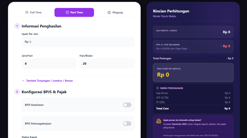 Jika ingin cara yang lebih ringkas, Anda bisa coba menghitung dengan kalkulator gaji harian, tetapi kurang cocok untuk kebutuhan skala besar.