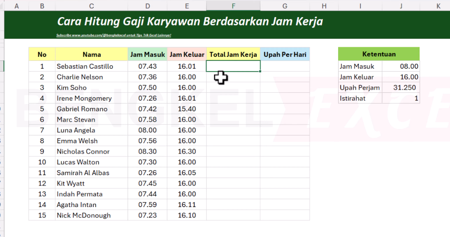 Data ini yang menjadi dasar dalam menghitung gaji per jam Excel. Pastikan semua data sudah terisi dengan benar.