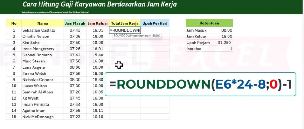 Namun hasilnya masih dalam format waktu. Oleh karena itu, perlu dikonversi ke jam dengan mengalikan 24 dengan fungsi =RUNDOWN. Jangan lupa, kurangi waktu istirahat (misalnya 1 jam) untuk mendapatkan jam kerja bersih.