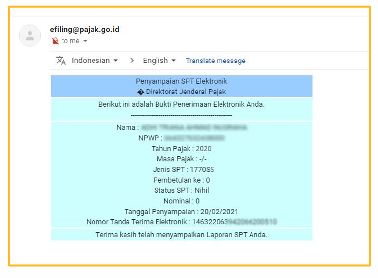 Setelah SPT berhasil dikirim, BPE akan muncul di layar dan dikirim ke email. Simpan atau unduh BPE sebagai bukti resmi pelaporan SPT Tahunan.