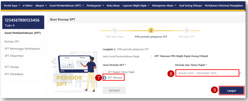 - Tentukan periode “Januari – Desember 2025”, dan pilih status “SPT Normal”.