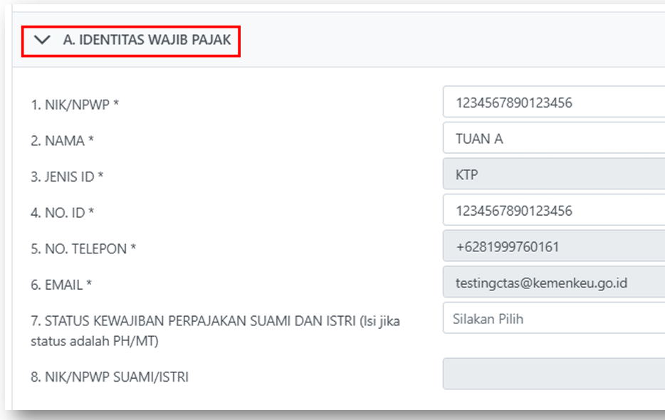 - Data NIK, NPWP, Nama Lengkap, Alamat, Nomor Telepon, dan Email akan terisi secara otomatis. Cek kembali kebenarannya.