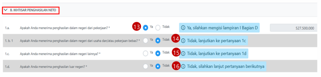 - Angka 1B, 1C, dan 1D: Jika Anda murni karyawan satu perusahaan, pilih “Tidak” untuk opsi penghasilan dari usaha, penghasilan lainnya, atau penghasilan luar negeri.