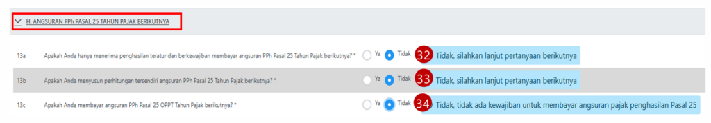 - Pada Bagian H (13A, 13B, 13C), pilih “Tidak” karena Anda adalah karyawan, bukan pengusaha yang membayar cicilan pajak bulanan sendiri.
