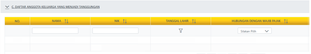 - Pastikan daftar tanggungan sudah terisi otomatis berdasarkan data Unit Pajak Keluarga. Jika terdapat perubahan data keluarga, Anda dapat melakukan penyesuaian melalui menu Profil Saya di portal Coretax.