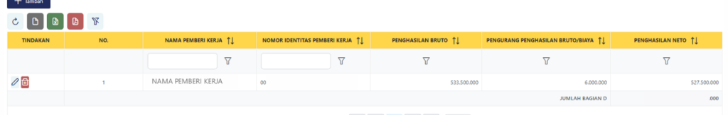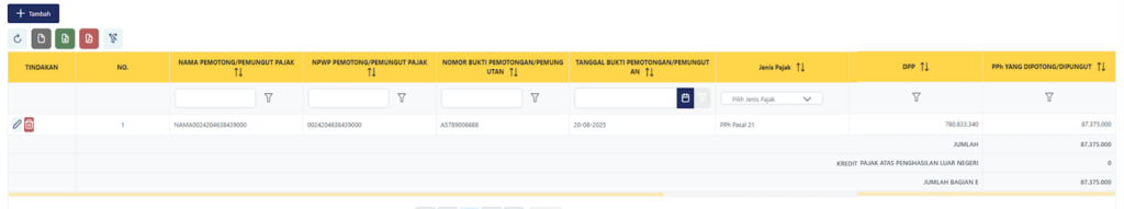 - Tabel Daftar Bukti Pemotongan/Pemungutan PPh akan terisi secara otomatis berdasarkan data pajak yang telah dipotong oleh pemberi kerja melalui dokumen Bukti Potong (seperti BPA1).