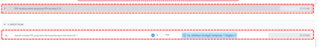 - Pastikan nilai pada bagian C.9 (PPh terutang setelah pengurang PPh terutang) memiliki angka yang sama persis dengan bagian D.10a (Apakah terdapat PPh yang telah dipotong/dipungut oleh pihak lain).