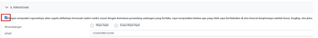 - Pada bagian Induk Pernyataan, centang kotak pernyataan untuk mengonfirmasi bahwa seluruh data yang diisi adalah benar, lengkap, dan jelas.