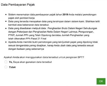 Jika datanya sesuai, pilih “Ya, gunakan data tersebut.” Jika tidak ingin menggunakan data otomatis, pilih “Tidak” dan isi SPT berdasarkan Bukti Potong 1721-A1/A2.