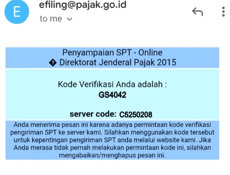 Periksa email Anda. Cari pesan dari DJP Online yang berisi kode verifikasi 6 digit. Salin kode tersebut dan masukkan ke kolom yang tersedia pada halaman e-Filing.