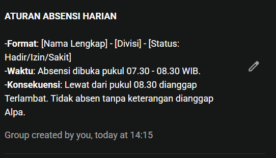 Selanjutnya, buat dan cantumkan peraturan absensi resmi pada bagian deskripsi grup atau gunakan fitur Pin Message agar aturan tersebut selalu berada di posisi paling atas.