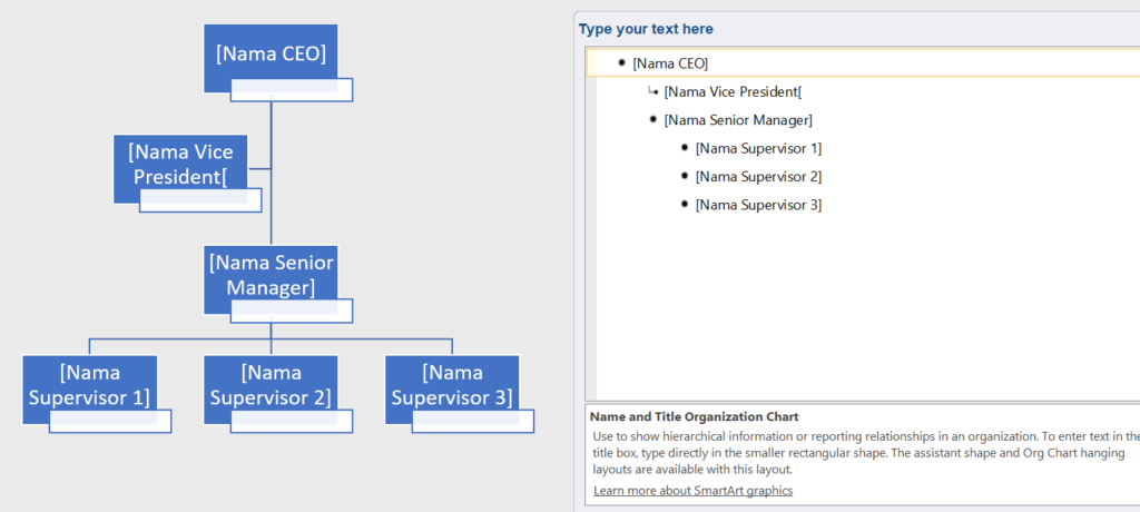 Sebagai contoh, struktur organisasi berikut menggunakan Name and Title Organization Chart. Klik OK dan akan tampil Text Pane.