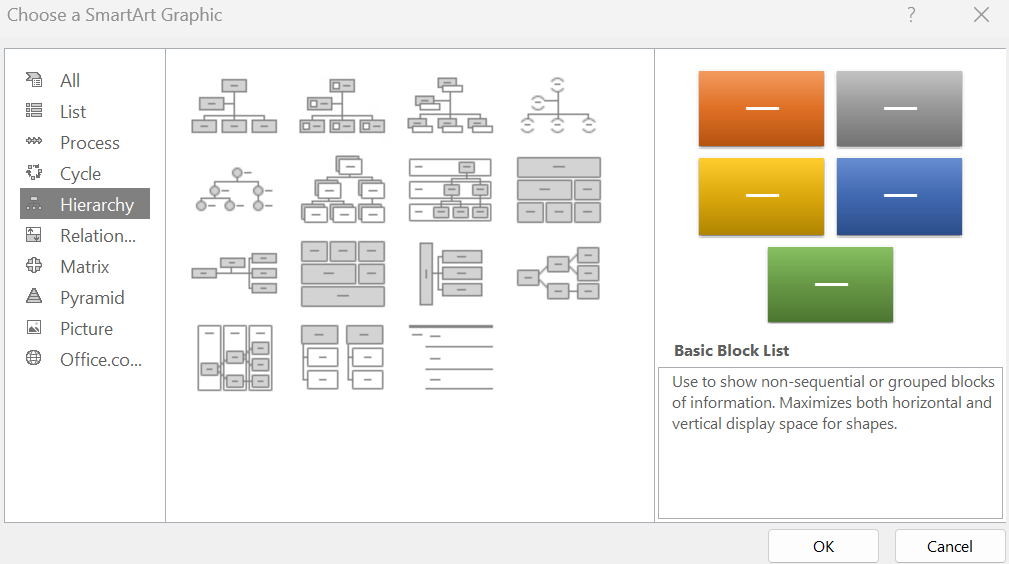Pilih template SmartArt sesuai dengan kebutuhan atau gaya perusahaan Anda. Ada yang tampil horizontal, ada juga yang vertikal.