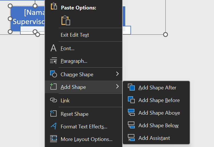Misalnya, ingin menambah bawahan Supervisor, maka klik kanan kotak Supervisor dan pilih Add Shape > Add Shape Below.
