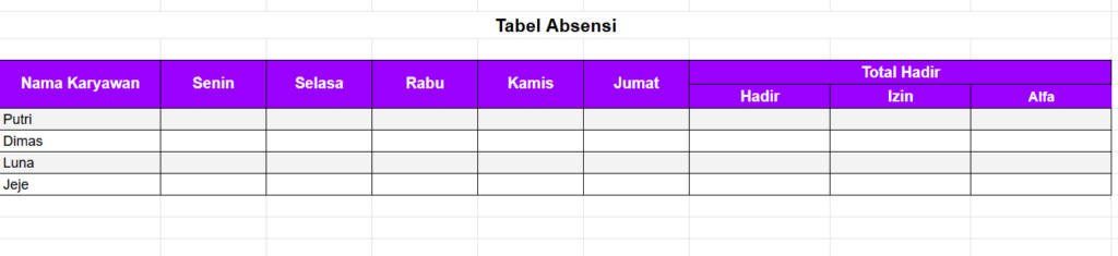 Siapkan dulu format tabel absensi sebagai dasar rekap data. Buat tabel dengan struktur sebagai berikut: