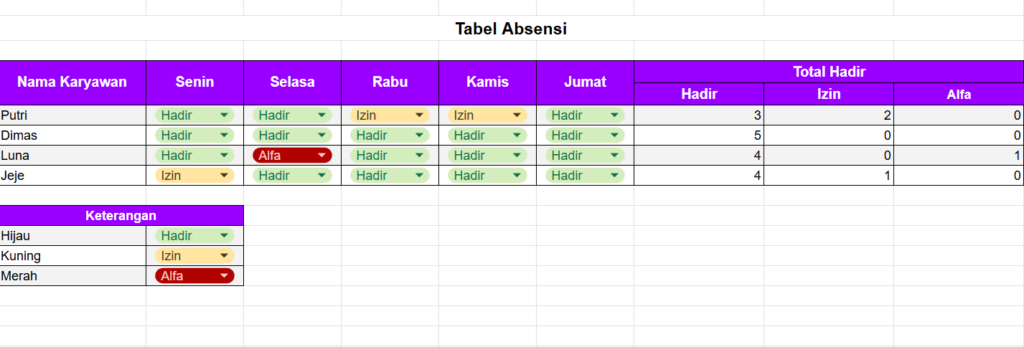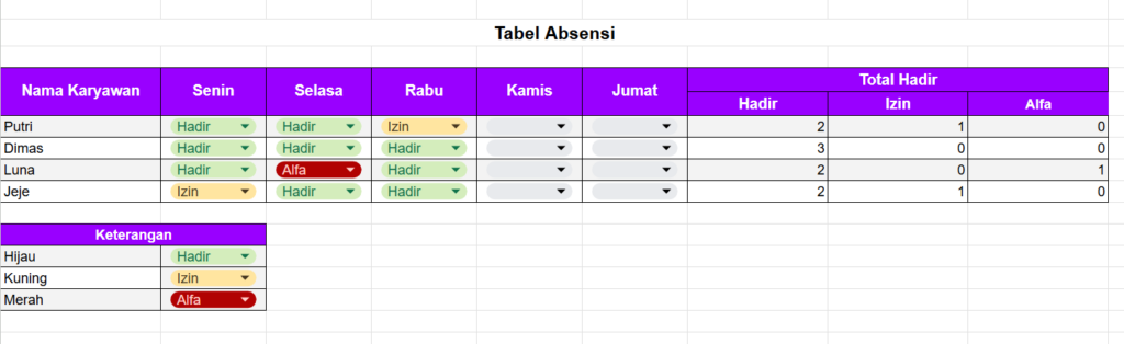 Setelah status kehadiran bisa dipilih melalui dropdown, langkah berikutnya adalah membuat rekap otomatis.