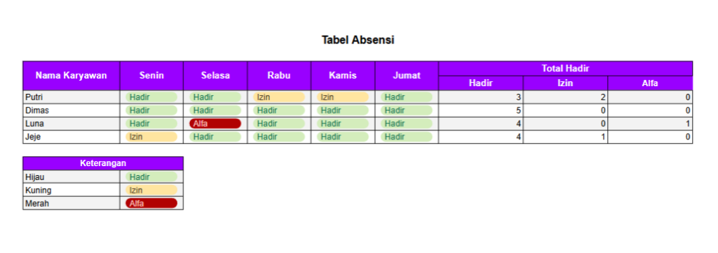 - Kolom terakhir: Rekap total (Hadir, Izin, Alfa)