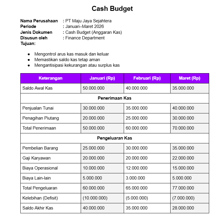 Cash budget atau anggaran kas adalah dokumen perencanaan keuangan yang memperkirakan arus kas masuk dan keluar perusahaan dalam periode tertentu.