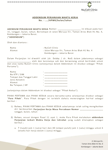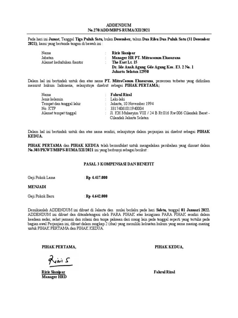 Berikut adalah struktur umum dalam addendum perjanjian yang biasanya digunakan dalam praktik bisnis maupun HR: