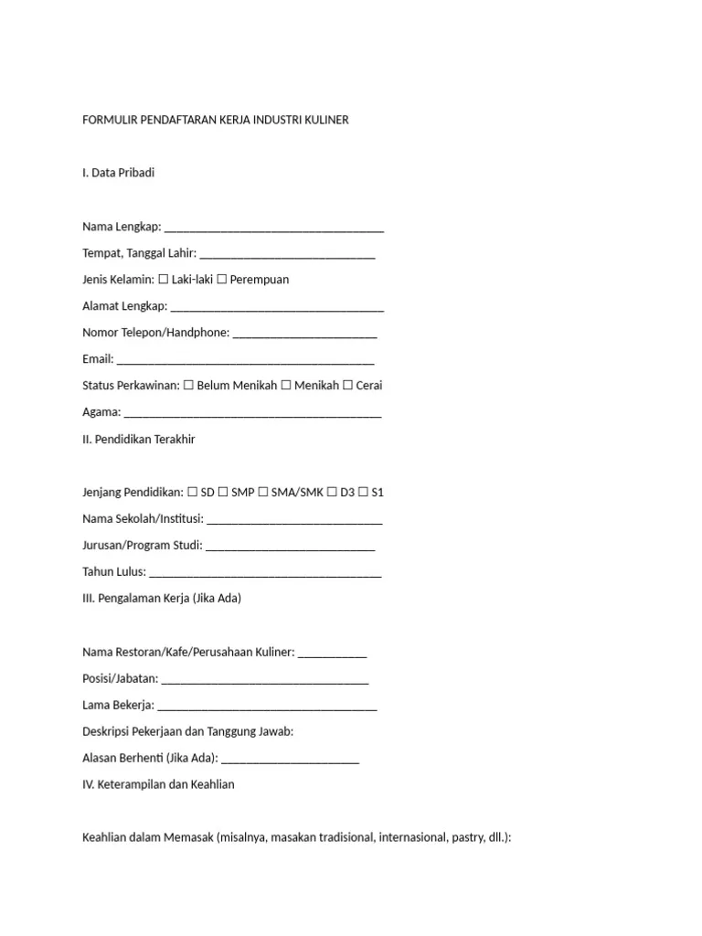 Formulir ini digunakan untuk melamar posisi staf dapur di restoran, hotel, atau usaha kuliner, dengan fokus pada data diri, pengalaman kerja di bidang makanan, dan kesiapan kerja di dapur.