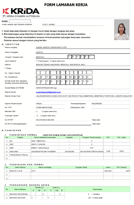 Bagian ini menunjukkan bagaimana format pengisian formulir lamaran kerja yang sudah diisi oleh pelamar.