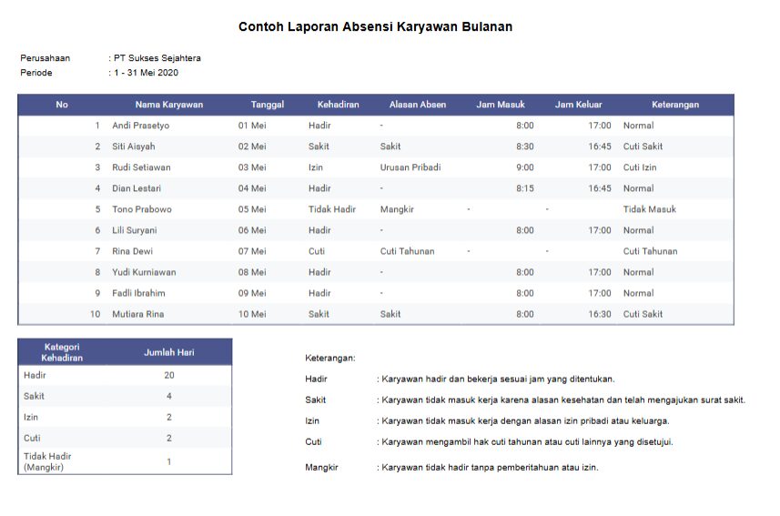 Laporan kehadiran dan absensi adalah komponen dasar dalam setiap laporan HRD. Laporan ini berisi informasi mengenai kehadiran harian karyawan, termasuk hari kerja, izin, sakit, mangkir, dan cuti.
