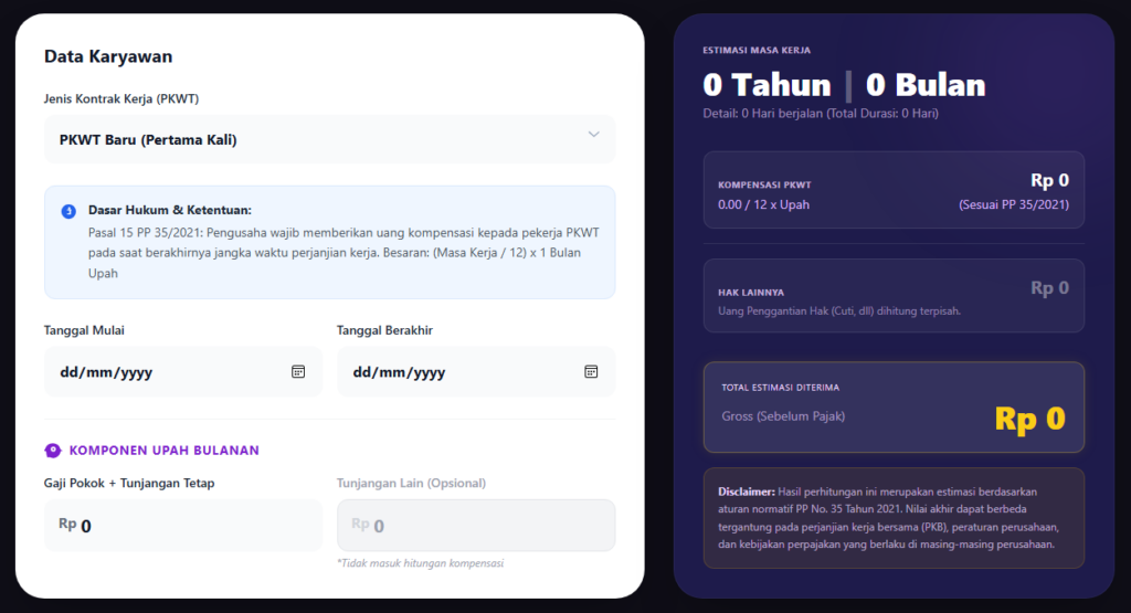 Selain itu, terdapat kalkulator kompensasi PKWT untuk membantu HR menghitung nilai uang kompensasi secara otomatis sesuai regulasi terbaru.
