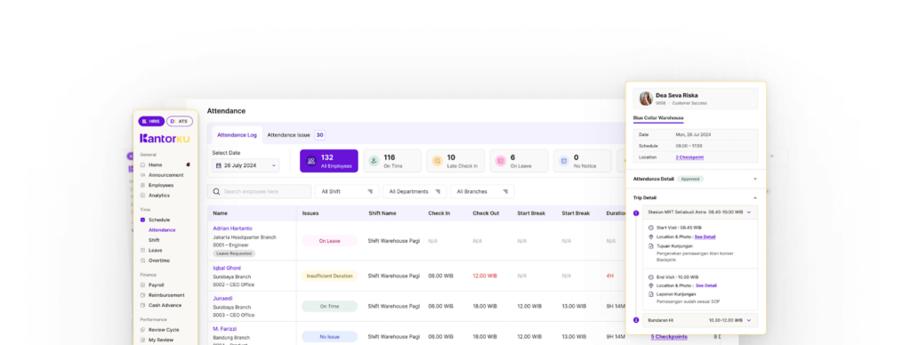 KantorKu HRIS juga terintegrasi dengan attendance management, sehingga cuti yang disetujui akan otomatis memotong saldo cuti karyawan tanpa rekap manual.