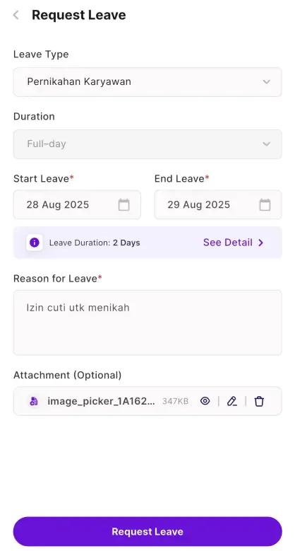 - Kebijakan Cuti Khusus Fleksibel: Atur parameter khusus untuk cuti menikah atau melahirkan dengan sistem validasi lampiran dokumen digital.