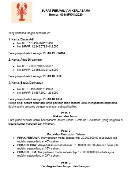 Surat perjanjian kerja sama ini mengikat tiga pihak untuk sebuah restoran, lengkap dengan penjelasan hak, kewajiban, hingga modal. Bisa menjadi referensi bagi yang ingin memulai usaha.