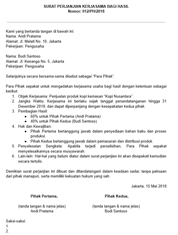2. Contoh Surat Perjanjian Kerja Sama 2 Orang
