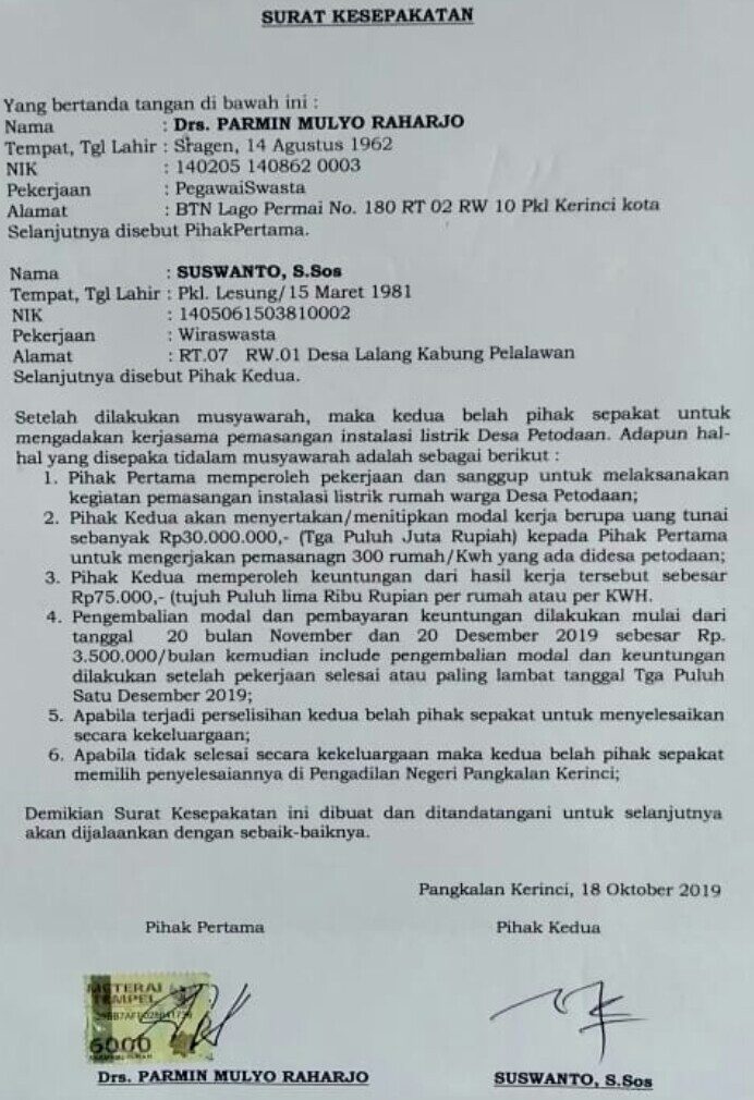 Berikut ini adalah contoh surat perjanjian yang sudah dilengkapi materai, digunakan untuk kerjasama pemasangan listrik di desa, sehingga bisa langsung dijadikan referensi sesuaikan kebutuhan.