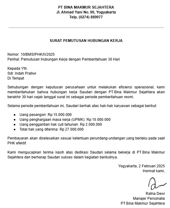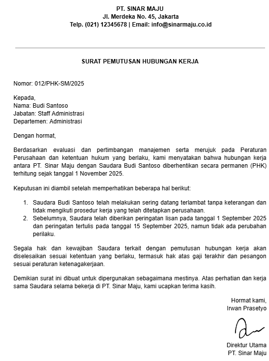 PHK ini dilakukan setelah evaluasi kinerja menunjukkan hasil yang tidak memenuhi standar perusahaan. Surat menyertakan alasan spesifik dan dokumentasi kinerja sebagai bukti.