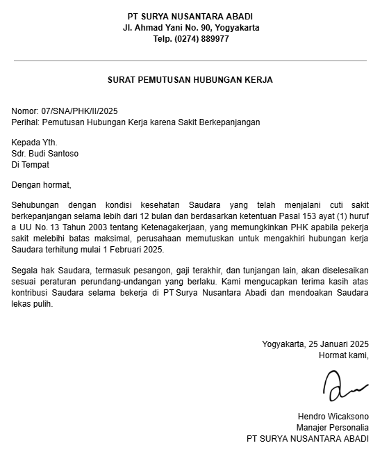 7. Contoh Surat PHK Karyawan karena Sakit Berkepanjangan