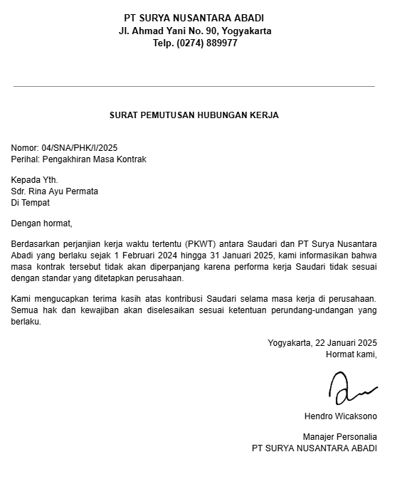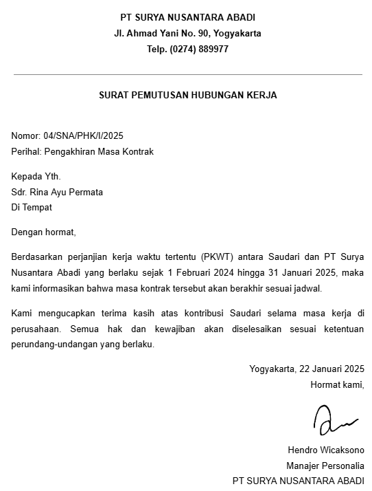 Surat ini menegaskan bahwa hubungan kerja berakhir seiring habisnya periode kontrak. Karyawan diberi informasi tentang hak dan kewajiban terakhir yang harus diselesaikan.