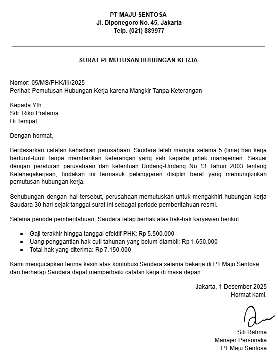 Baca Juga: PHK karena Mangkir: Aturan, Dasar Hukum, dan 5 Contoh Suratnya!
