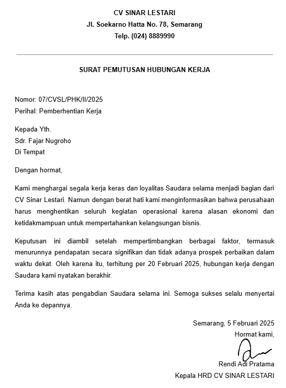 Surat ini bersifat pemberitahuan resmi mengenai PHK yang akan berlaku pada tanggal tertentu. Tujuannya memberi karyawan informasi yang jelas dan waktu untuk menyiapkan transisi.