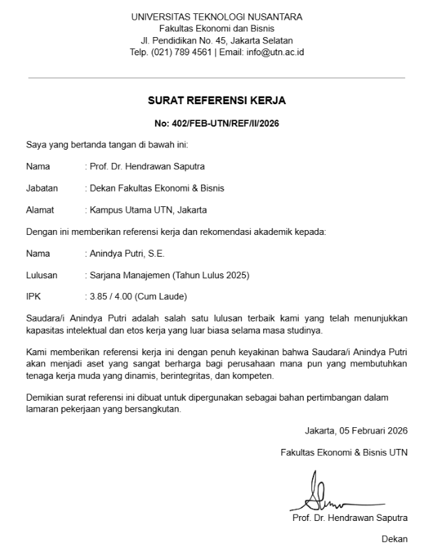 Lulusan baru biasanya mendapatkan referensi dari dosen pembimbing atau atasan tempat magang. Surat ini lebih menekankan pada potensi dan kemampuan belajar kandidat meski belum memiliki pengalaman kerja tetap.