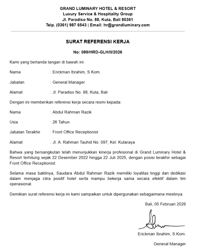 Industri perhotelan sangat mengutamakan hospitality dan SOP yang ketat. Referensi kerja di hotel akan menjelaskan divisi tempat bekerja dan kualitas pelayanan yang diberikan.