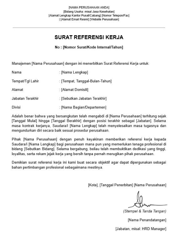 Surat dianggap sah jika dibubuhi tanda tangan pejabat berwenang (HRD atau atasan langsung) dan stempel perusahaan. Sertakan juga kontak aktif agar pihak rekruter bisa melakukan pemeriksaan latar belakang (background check) jika diperlukan.