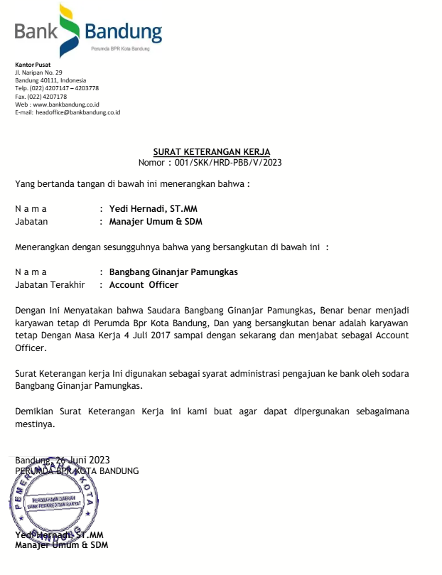 11. Contoh Surat Referensi Kerja di Bank