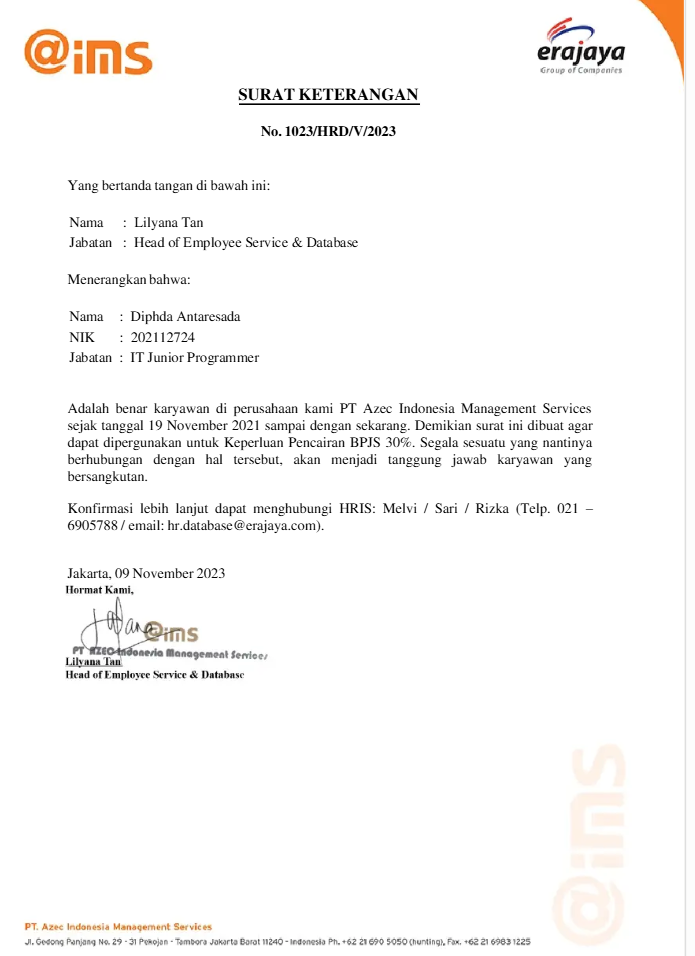 - Surat Pengalaman Kerja: Digunakan untuk syarat administratif seperti pencairan JHT BPJS Ketenagakerjaan atau pengajuan kredit bank.