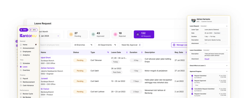 Dengan KantorKu HRIS, proses pengelolaan cuti jadi lebih cepat, sehingga HR tidak perlu repot memeriksa riwayat cuti satu per satu.
