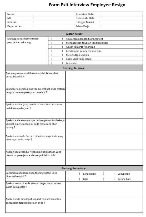 Umunya, isi form exit interview adalah pertanyaan tentang alasan resign, kesan terhadap perusahaan, pengalaman budaya kerja, serta saran perbaikan yang bisa diterapkan.