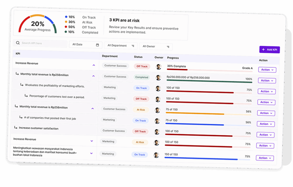 Fitur performance management dengan KPI, OKR, dan Review 360 membantu menilai kinerja secara objektif, sehingga Anda dapat memahami apakah alasan keluar terkait manajemen atau faktor lain.